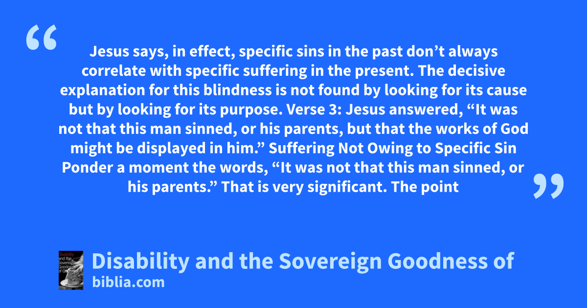 Jesus says, in effect, specific sins in the past don’t always correlate with specific suffering in the present. The decisive explanation for this blindness is not found by looking for its cause but by looking for its purpose. Verse 3: Jesus answered, “It was not that this man sinned, or his parents, but that the works of God might be displayed in him.” Suffering Not Owing to Specific Sin Ponder a moment the words, “It was not that this man sinned, or his parents.” That is very significant. The point