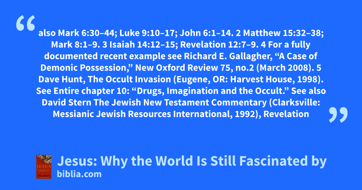 also Mark 6:30–44; Luke 9:10–17; John 6:1–14. 2 Matthew 15:32–38; Mark 8:1–9. 3 Isaiah 14:12–15; Revelation 12:7–9. 4 For a fully documented recent example see Richard E. Gallagher, “A Case of Demonic Possession,” New Oxford Review 75, no.2 (March 2008). 5 Dave Hunt, The Occult Invasion (Eugene, OR: Harvest House, 1998). See Entire chapter 10: “Drugs, Imagination and the Occult.” See also David Stern The Jewish New Testament Commentary (Clarksville: Messianic Jewish Resources International, 1992), Revelation