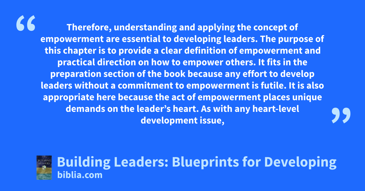 Therefore, understanding and applying the concept of empowerment are essential to developing leaders. The purpose of this chapter is to provide a clear definition of empowerment and practical direction on how to empower others. It fits in the preparation section of the book because any effort to develop leaders without a commitment to empowerment is futile. It is also appropriate here because the act of empowerment places unique demands on the leader’s heart. As with any heart-level development issue,