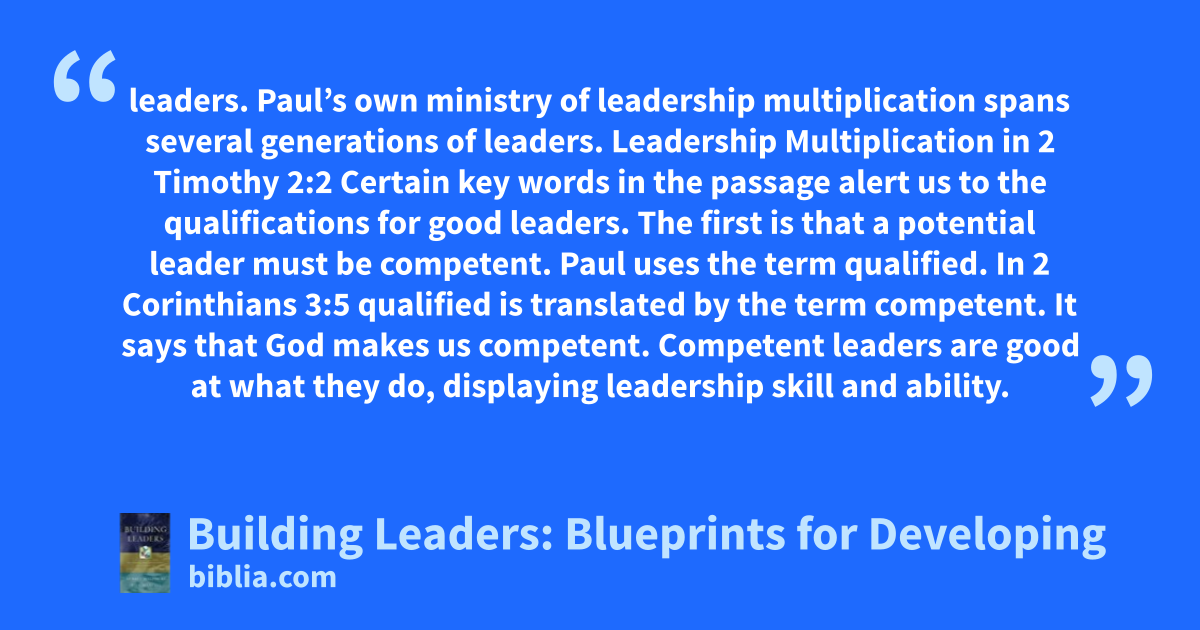 leaders. Paul’s own ministry of leadership multiplication spans several generations of leaders. Leadership Multiplication in 2 Timothy 2:2 Certain key words in the passage alert us to the qualifications for good leaders. The first is that a potential leader must be competent. Paul uses the term qualified. In 2 Corinthians 3:5 qualified is translated by the term competent. It says that God makes us competent. Competent leaders are good at what they do, displaying leadership skill and ability.