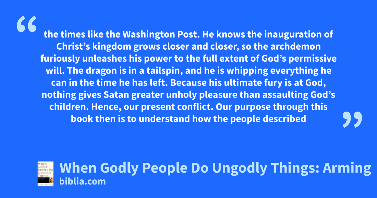the times like the Washington Post. He knows the inauguration of Christ’s kingdom grows closer and closer, so the archdemon furiously unleashes his power to the full extent of God’s permissive will. The dragon is in a tailspin, and he is whipping everything he can in the time he has left. Because his ultimate fury is at God, nothing gives Satan greater unholy pleasure than assaulting God’s children. Hence, our present conflict. Our purpose through this book then is to understand how the people described