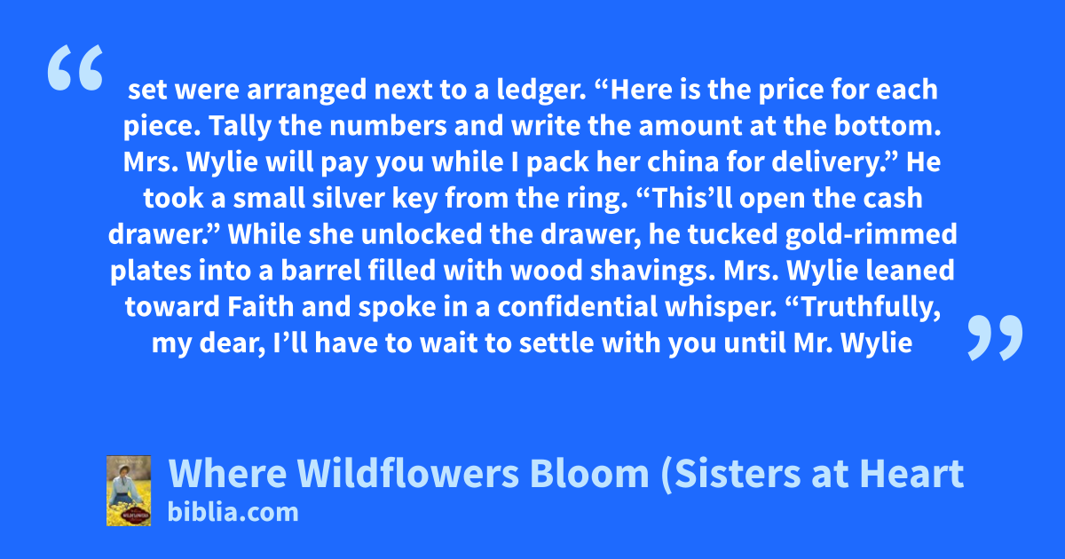 set were arranged next to a ledger. “Here is the price for each piece. Tally the numbers and write the amount at the bottom. Mrs. Wylie will pay you while I pack her china for delivery.” He took a small silver key from the ring. “This’ll open the cash drawer.” While she unlocked the drawer, he tucked gold-rimmed plates into a barrel filled with wood shavings. Mrs. Wylie leaned toward Faith and spoke in a confidential whisper. “Truthfully, my dear, I’ll have to wait to settle with you until Mr. Wylie
