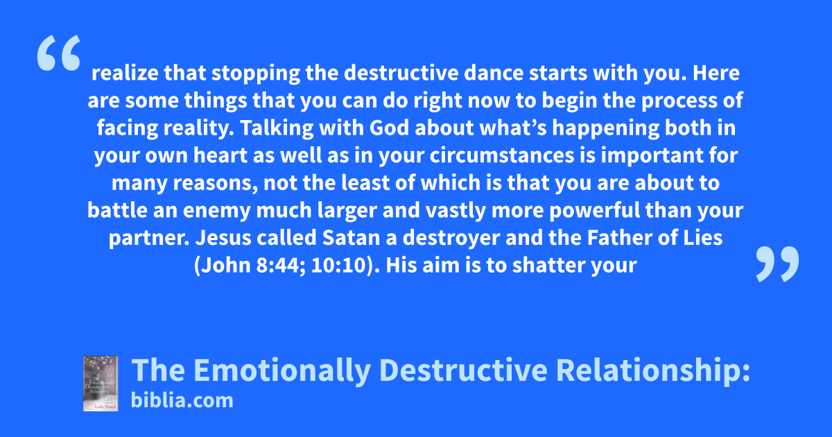 realize that stopping the destructive dance starts with you. Here are some things that you can do right now to begin the process of facing reality. Talking with God about what’s happening both in your own heart as well as in your circumstances is important for many reasons, not the least of which is that you are about to battle an enemy much larger and vastly more powerful than your partner. Jesus called Satan a destroyer and the Father of Lies (John 8:44; 10:10). His aim is to shatter your