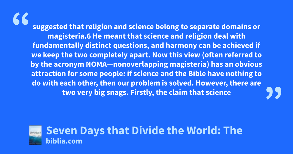 suggested that religion and science belong to separate domains or magisteria.6 He meant that science and religion deal with fundamentally distinct questions, and harmony can be achieved if we keep the two completely apart. Now this view (often referred to by the acronym NOMA—nonoverlapping magisteria) has an obvious attraction for some people: if science and the Bible have nothing to do with each other, then our problem is solved. However, there are two very big snags. Firstly, the claim that science