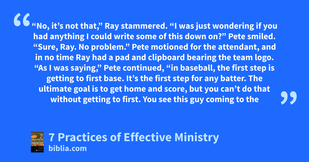 “No, it’s not that,” Ray stammered. “I was just wondering if you had anything I could write some of this down on?” Pete smiled. “Sure, Ray. No problem.” Pete motioned for the attendant, and in no time Ray had a pad and clipboard bearing the team logo. “As I was saying,” Pete continued, “in baseball, the first step is getting to first base. It’s the first step for any batter. The ultimate goal is to get home and score, but you can’t do that without getting to first. You see this guy coming to the