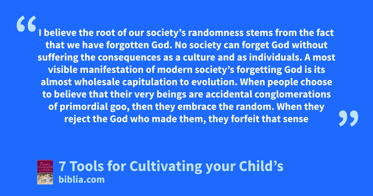 I believe the root of our society’s randomness stems from the fact that we have forgotten God. No society can forget God without suffering the consequences as a culture and as individuals. A most visible manifestation of modern society’s forgetting God is its almost wholesale capitulation to evolution. When people choose to believe that their very beings are accidental conglomerations of primordial goo, then they embrace the random. When they reject the God who made them, they forfeit that sense