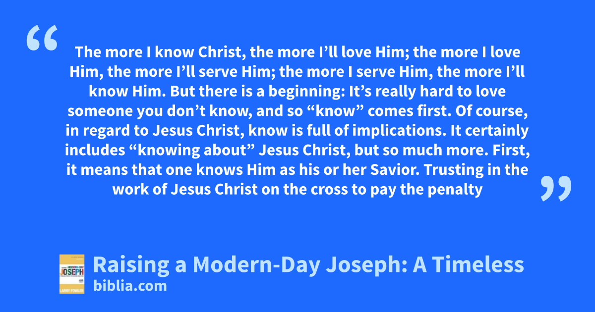 The more I know Christ, the more I’ll love Him; the more I love Him, the more I’ll serve Him; the more I serve Him, the more I’ll know Him. But there is a beginning: It’s really hard to love someone you don’t know, and so “know” comes first. Of course, in regard to Jesus Christ, know is full of implications. It certainly includes “knowing about” Jesus Christ, but so much more. First, it means that one knows Him as his or her Savior. Trusting in the work of Jesus Christ on the cross to pay the penalty