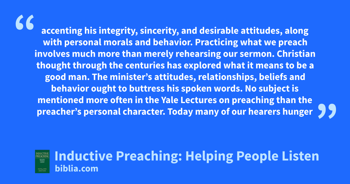 accenting his integrity, sincerity, and desirable attitudes, along with personal morals and behavior. Practicing what we preach involves much more than merely rehearsing our sermon. Christian thought through the centuries has explored what it means to be a good man. The minister’s attitudes, relationships, beliefs and behavior ought to buttress his spoken words. No subject is mentioned more often in the Yale Lectures on preaching than the preacher’s personal character. Today many of our hearers hunger