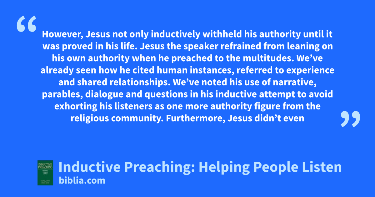 However, Jesus not only inductively withheld his authority until it was proved in his life. Jesus the speaker refrained from leaning on his own authority when he preached to the multitudes. We’ve already seen how he cited human instances, referred to experience and shared relationships. We’ve noted his use of narrative, parables, dialogue and questions in his inductive attempt to avoid exhorting his listeners as one more authority figure from the religious community. Furthermore, Jesus didn’t even