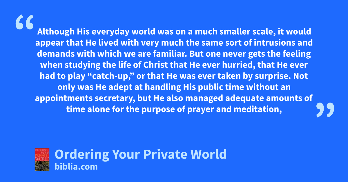Although His everyday world was on a much smaller scale, it would appear that He lived with very much the same sort of intrusions and demands with which we are familiar. But one never gets the feeling when studying the life of Christ that He ever hurried, that He ever had to play “catch-up,” or that He was ever taken by surprise. Not only was He adept at handling His public time without an appointments secretary, but He also managed adequate amounts of time alone for the purpose of prayer and meditation,