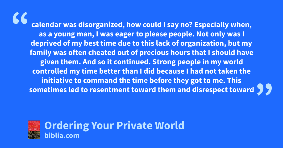 calendar was disorganized, how could I say no? Especially when, as a young man, I was eager to please people. Not only was I deprived of my best time due to this lack of organization, but my family was often cheated out of precious hours that I should have given them. And so it continued. Strong people in my world controlled my time better than I did because I had not taken the initiative to command the time before they got to me. This sometimes led to resentment toward them and disrespect toward