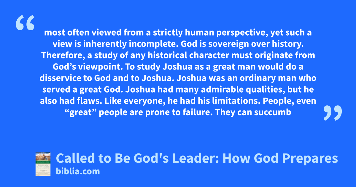 most often viewed from a strictly human perspective, yet such a view is inherently incomplete. God is sovereign over history. Therefore, a study of any historical character must originate from God’s viewpoint. To study Joshua as a great man would do a disservice to God and to Joshua. Joshua was an ordinary man who served a great God. Joshua had many admirable qualities, but he also had flaws. Like everyone, he had his limitations. People, even “great” people are prone to failure. They can succumb