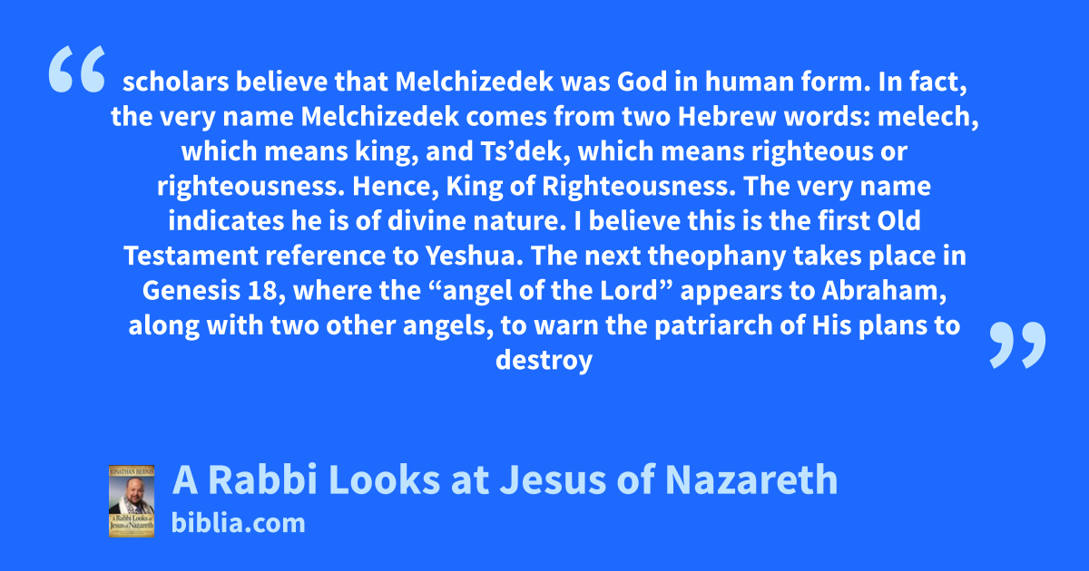 scholars believe that Melchizedek was God in human form. In fact, the very name Melchizedek comes from two Hebrew words: melech, which means king, and Ts’dek, which means righteous or righteousness. Hence, King of Righteousness. The very name indicates he is of divine nature. I believe this is the first Old Testament reference to Yeshua. The next theophany takes place in Genesis 18, where the “angel of the Lord” appears to Abraham, along with two other angels, to warn the patriarch of His plans to destroy