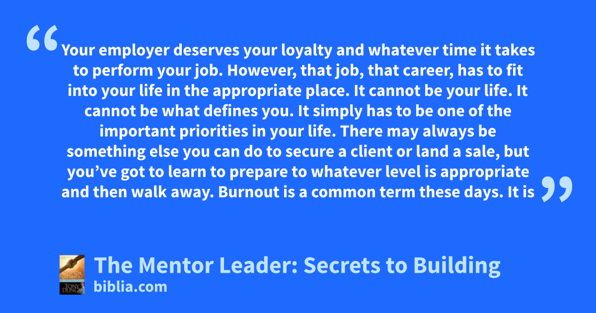 Your employer deserves your loyalty and whatever time it takes to perform your job. However, that job, that career, has to fit into your life in the appropriate place. It cannot be your life. It cannot be what defines you. It simply has to be one of the important priorities in your life. There may always be something else you can do to secure a client or land a sale, but you’ve got to learn to prepare to whatever level is appropriate and then walk away. Burnout is a common term these days. It is