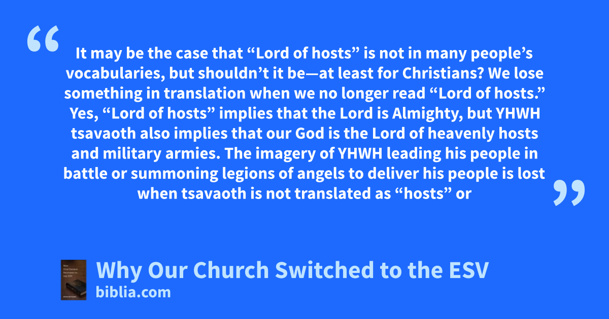 It may be the case that “Lord of hosts” is not in many people’s vocabularies, but shouldn’t it be—at least for Christians? We lose something in translation when we no longer read “Lord of hosts.” Yes, “Lord of hosts” implies that the Lord is Almighty, but YHWH tsavaoth also implies that our God is the Lord of heavenly hosts and military armies. The imagery of YHWH leading his people in battle or summoning legions of angels to deliver his people is lost when tsavaoth is not translated as “hosts” or