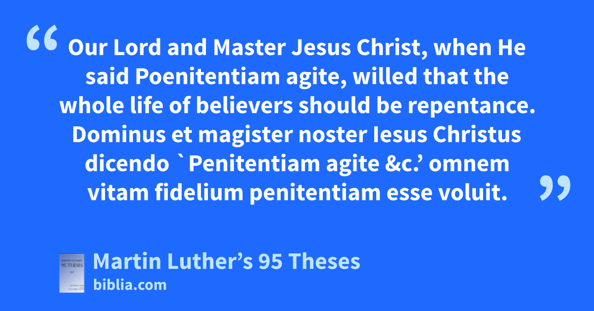 Our Lord and Master Jesus Christ, when He said Poenitentiam agite, willed that the whole life of believers should be repentance. Dominus et magister noster Iesus Christus dicendo `Penitentiam agite &c.’ omnem vitam fidelium penitentiam esse voluit.