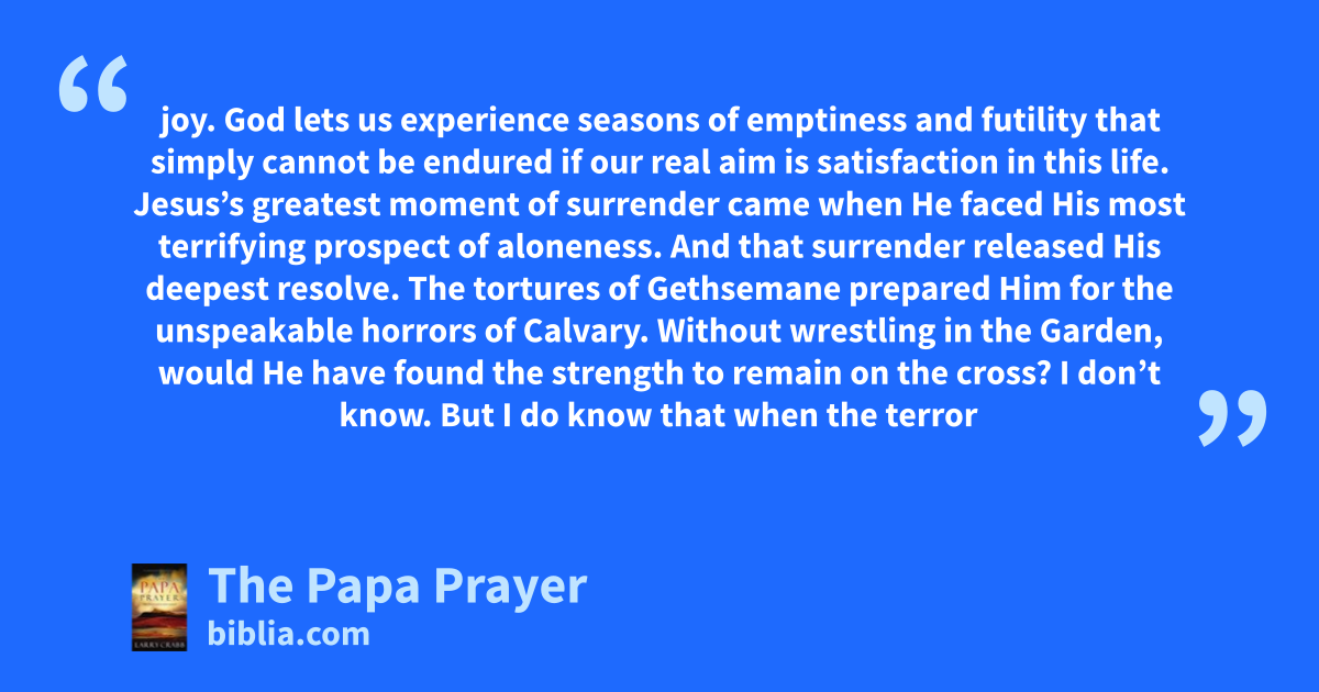 joy. God lets us experience seasons of emptiness and futility that simply cannot be endured if our real aim is satisfaction in this life. Jesus’s greatest moment of surrender came when He faced His most terrifying prospect of aloneness. And that surrender released His deepest resolve. The tortures of Gethsemane prepared Him for the unspeakable horrors of Calvary. Without wrestling in the Garden, would He have found the strength to remain on the cross? I don’t know. But I do know that when the terror