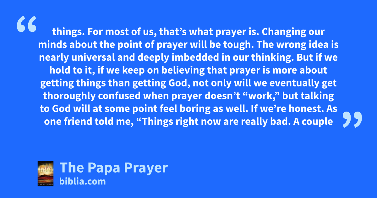 things. For most of us, that’s what prayer is. Changing our minds about the point of prayer will be tough. The wrong idea is nearly universal and deeply imbedded in our thinking. But if we hold to it, if we keep on believing that prayer is more about getting things than getting God, not only will we eventually get thoroughly confused when prayer doesn’t “work,” but talking to God will at some point feel boring as well. If we’re honest. As one friend told me, “Things right now are really bad. A couple