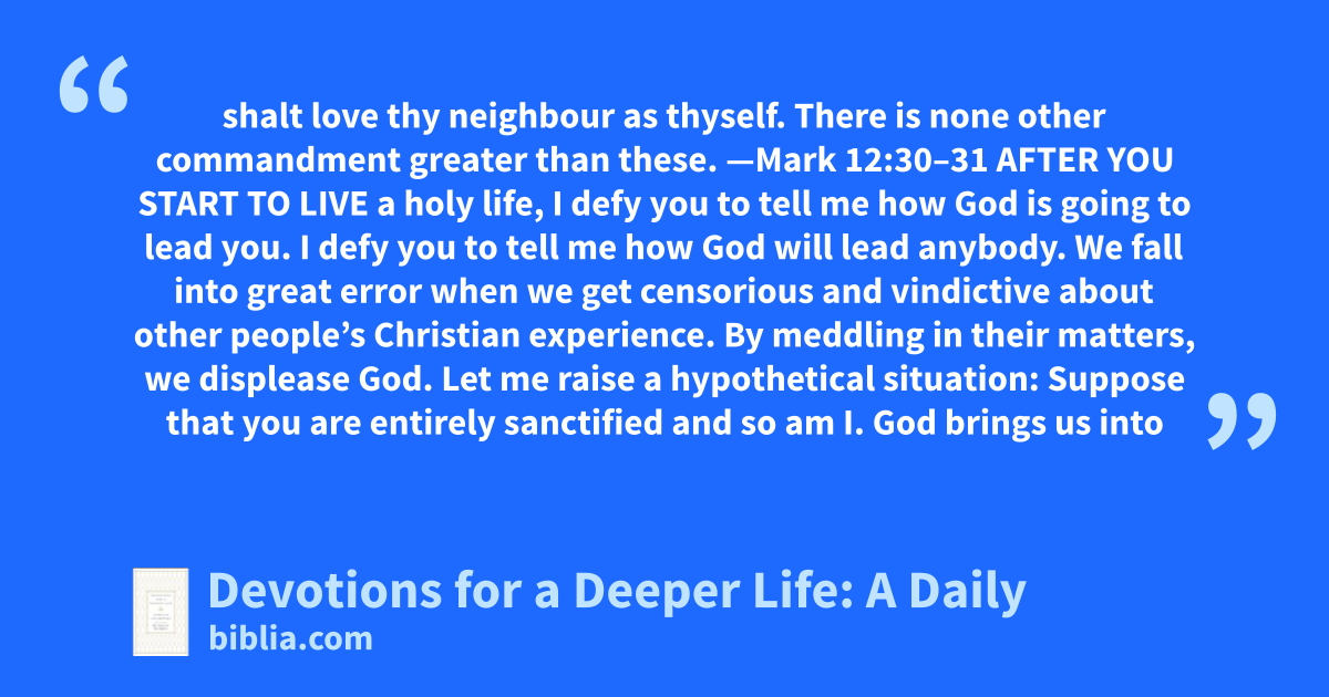 shalt love thy neighbour as thyself. There is none other commandment greater than these. —Mark 12:30–31 AFTER YOU START TO LIVE a holy life, I defy you to tell me how God is going to lead you. I defy you to tell me how God will lead anybody. We fall into great error when we get censorious and vindictive about other people’s Christian experience. By meddling in their matters, we displease God. Let me raise a hypothetical situation: Suppose that you are entirely sanctified and so am I. God brings us into