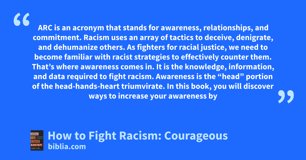 ARC is an acronym that stands for awareness, relationships, and commitment. Racism uses an array of tactics to deceive, denigrate, and dehumanize others. As fighters for racial justice, we need to become familiar with racist strategies to effectively counter them. That’s where awareness comes in. It is the knowledge, information, and data required to fight racism. Awareness is the “head” portion of the head-hands-heart triumvirate. In this book, you will discover ways to increase your awareness by