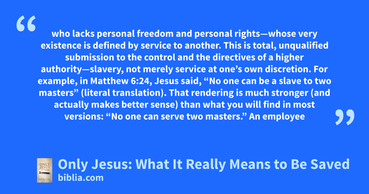 who lacks personal freedom and personal rights—whose very existence is defined by service to another. This is total, unqualified submission to the control and the directives of a higher authority—slavery, not merely service at one’s own discretion. For example, in Matthew 6:24, Jesus said, “No one can be a slave to two masters” (literal translation). That rendering is much stronger (and actually makes better sense) than what you will find in most versions: “No one can serve two masters.” An employee