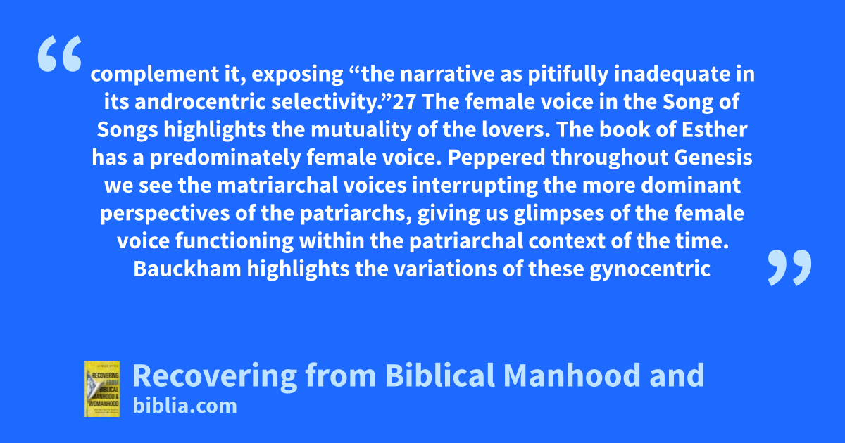 complement it, exposing “the narrative as pitifully inadequate in its androcentric selectivity.”27 The female voice in the Song of Songs highlights the mutuality of the lovers. The book of Esther has a predominately female voice. Peppered throughout Genesis we see the matriarchal voices interrupting the more dominant perspectives of the patriarchs, giving us glimpses of the female voice functioning within the patriarchal context of the time. Bauckham highlights the variations of these gynocentric