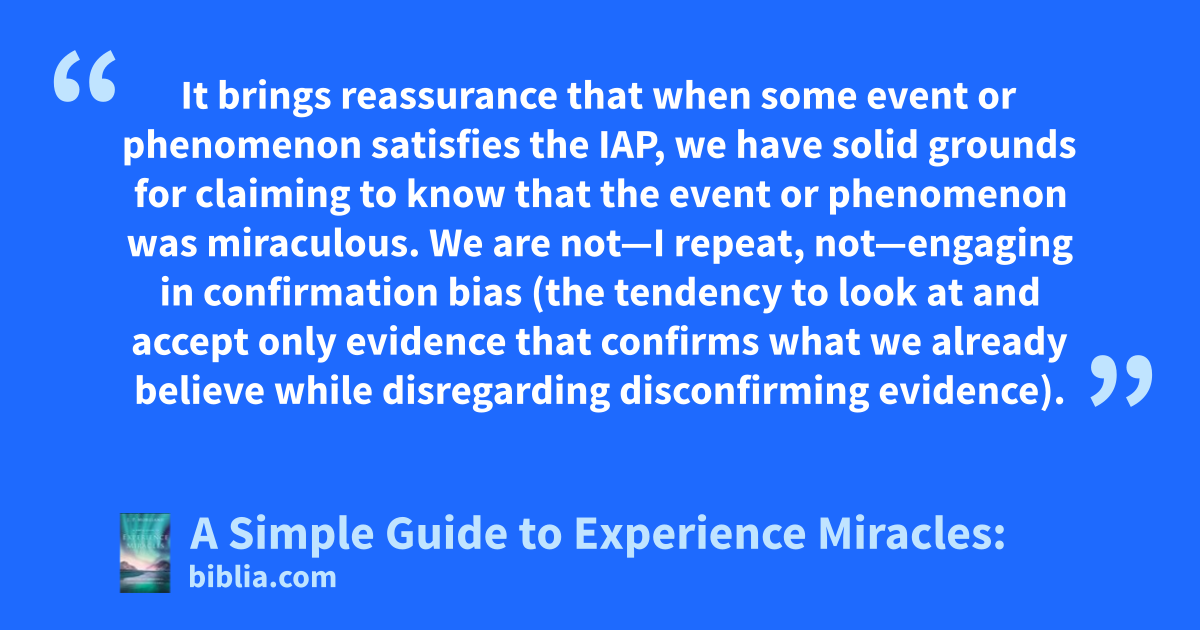 It brings reassurance that when some event or phenomenon satisfies the IAP, we have solid grounds for claiming to know that the event or phenomenon was miraculous. We are not—I repeat, not—engaging in confirmation bias (the tendency to look at and accept only evidence that confirms what we already believe while disregarding disconfirming evidence).