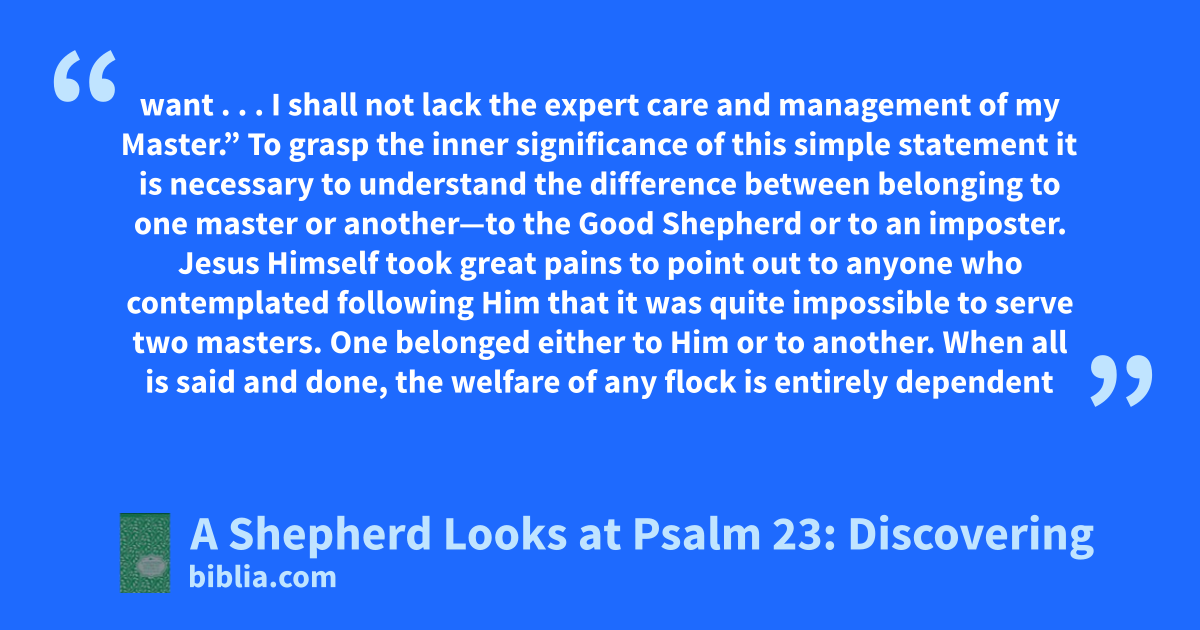 want . . . I shall not lack the expert care and management of my Master.” To grasp the inner significance of this simple statement it is necessary to understand the difference between belonging to one master or another—to the Good Shepherd or to an imposter. Jesus Himself took great pains to point out to anyone who contemplated following Him that it was quite impossible to serve two masters. One belonged either to Him or to another. When all is said and done, the welfare of any flock is entirely dependent