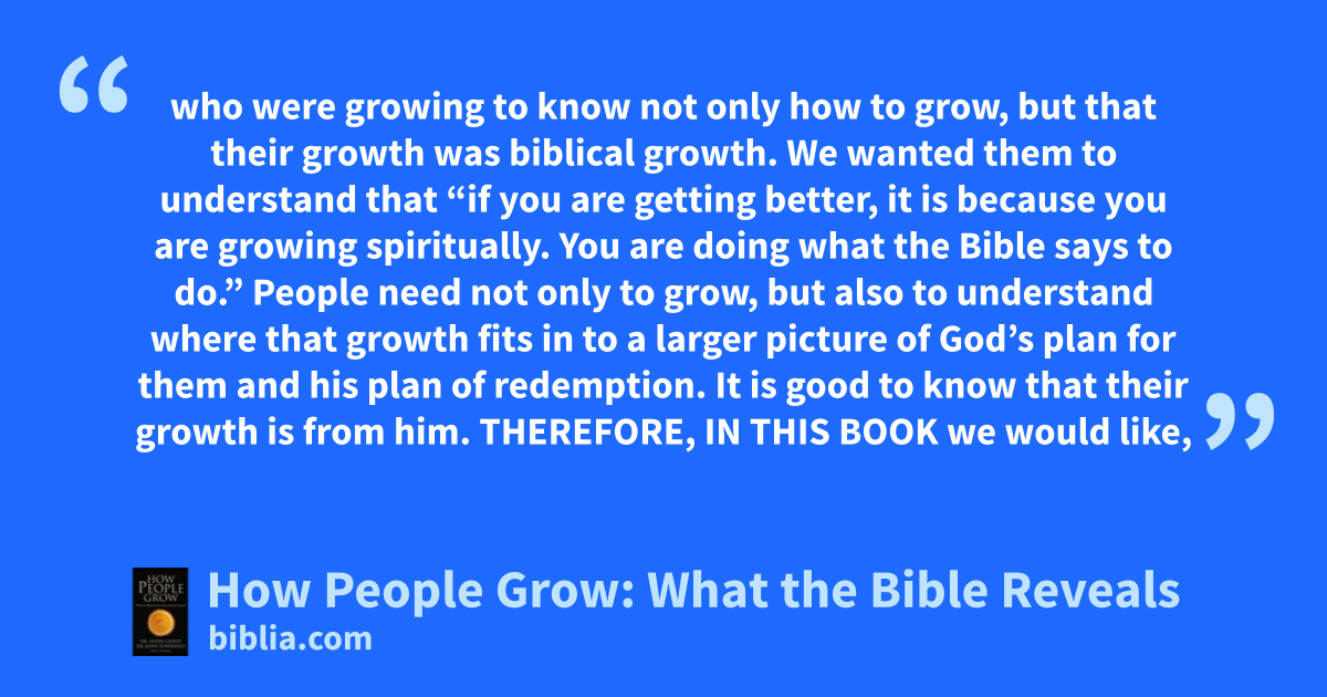 who were growing to know not only how to grow, but that their growth was biblical growth. We wanted them to understand that “if you are getting better, it is because you are growing spiritually. You are doing what the Bible says to do.” People need not only to grow, but also to understand where that growth fits in to a larger picture of God’s plan for them and his plan of redemption. It is good to know that their growth is from him. THEREFORE, IN THIS BOOK we would like,