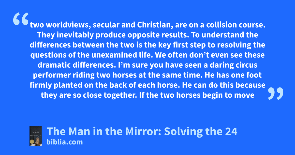 two worldviews, secular and Christian, are on a collision course. They inevitably produce opposite results. To understand the differences between the two is the key first step to resolving the questions of the unexamined life. We often don’t even see these dramatic differences. I’m sure you have seen a daring circus performer riding two horses at the same time. He has one foot firmly planted on the back of each horse. He can do this because they are so close together. If the two horses begin to move