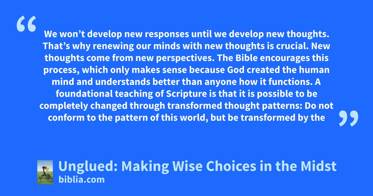 We won’t develop new responses until we develop new thoughts. That’s why renewing our minds with new thoughts is crucial. New thoughts come from new perspectives. The Bible encourages this process, which only makes sense because God created the human mind and understands better than anyone how it functions. A foundational teaching of Scripture is that it is possible to be completely changed through transformed thought patterns: Do not conform to the pattern of this world, but be transformed by the