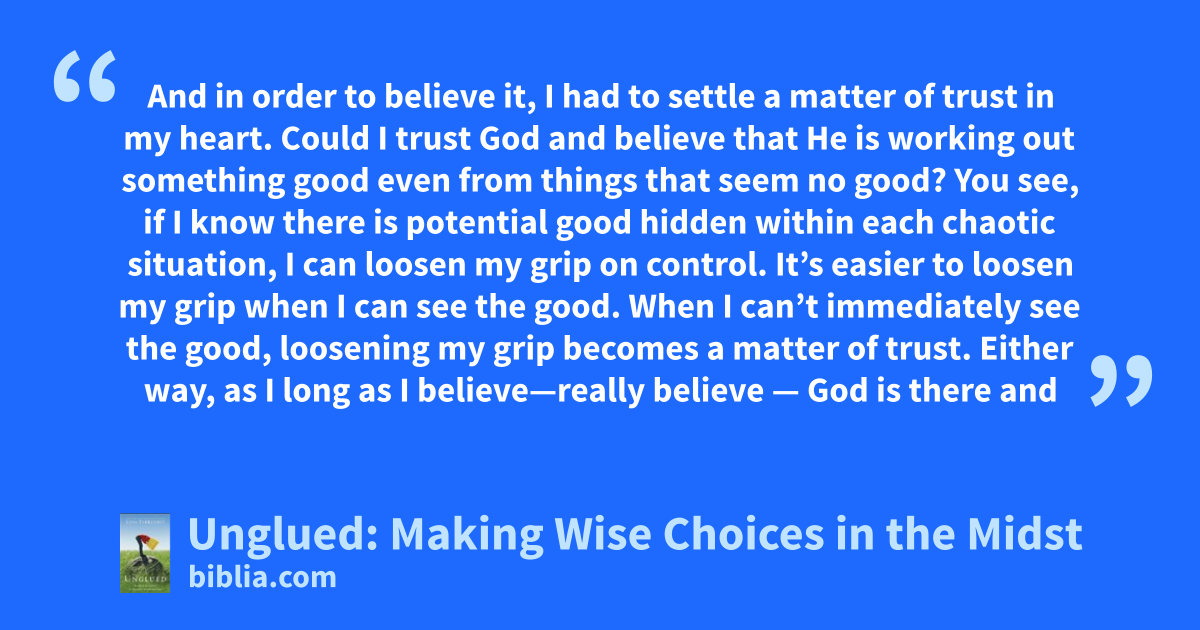 And in order to believe it, I had to settle a matter of trust in my heart. Could I trust God and believe that He is working out something good even from things that seem no good? You see, if I know there is potential good hidden within each chaotic situation, I can loosen my grip on control. It’s easier to loosen my grip when I can see the good. When I can’t immediately see the good, loosening my grip becomes a matter of trust. Either way, as I long as I believe—really believe — God is there and