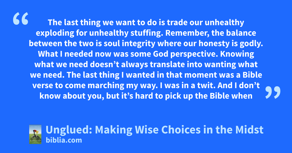 The last thing we want to do is trade our unhealthy exploding for unhealthy stuffing. Remember, the balance between the two is soul integrity where our honesty is godly. What I needed now was some God perspective. Knowing what we need doesn’t always translate into wanting what we need. The last thing I wanted in that moment was a Bible verse to come marching my way. I was in a twit. And I don’t know about you, but it’s hard to pick up the Bible when