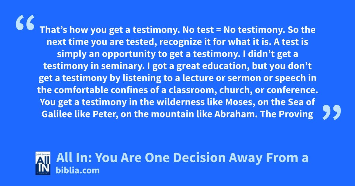 That’s how you get a testimony. No test = No testimony. So the next time you are tested, recognize it for what it is. A test is simply an opportunity to get a testimony. I didn’t get a testimony in seminary. I got a great education, but you don’t get a testimony by listening to a lecture or sermon or speech in the comfortable confines of a classroom, church, or conference. You get a testimony in the wilderness like Moses, on the Sea of Galilee like Peter, on the mountain like Abraham. The Proving
