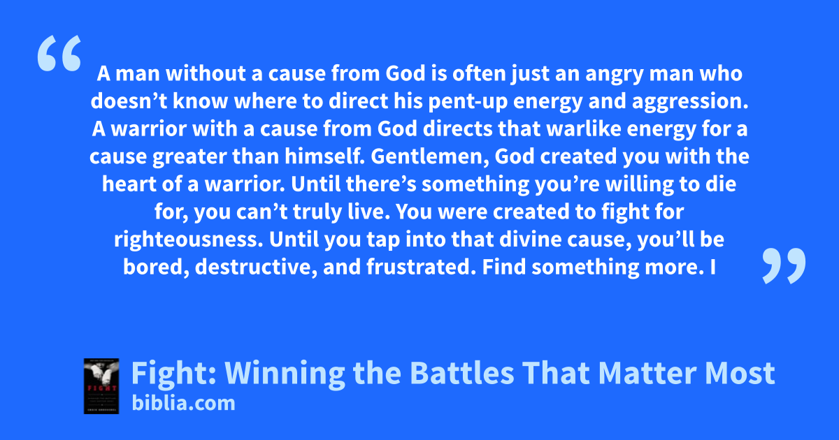 A man without a cause from God is often just an angry man who doesn’t know where to direct his pent-up energy and aggression. A warrior with a cause from God directs that warlike energy for a cause greater than himself. Gentlemen, God created you with the heart of a warrior. Until there’s something you’re willing to die for, you can’t truly live. You were created to fight for righteousness. Until you tap into that divine cause, you’ll be bored, destructive, and frustrated. Find something more. I