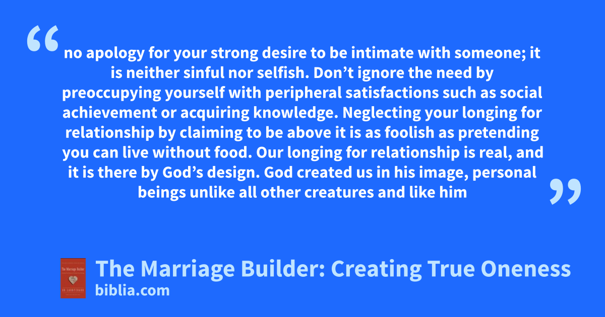 no apology for your strong desire to be intimate with someone; it is neither sinful nor selfish. Don’t ignore the need by preoccupying yourself with peripheral satisfactions such as social achievement or acquiring knowledge. Neglecting your longing for relationship by claiming to be above it is as foolish as pretending you can live without food. Our longing for relationship is real, and it is there by God’s design. God created us in his image, personal beings unlike all other creatures and like him