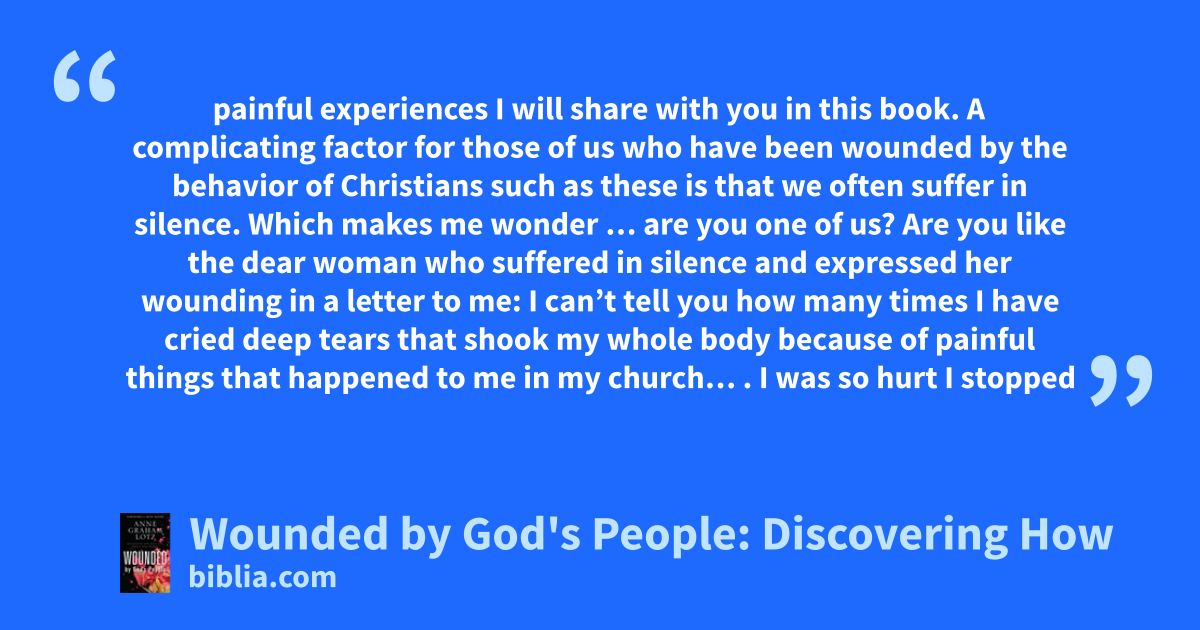 painful experiences I will share with you in this book. A complicating factor for those of us who have been wounded by the behavior of Christians such as these is that we often suffer in silence. Which makes me wonder … are you one of us? Are you like the dear woman who suffered in silence and expressed her wounding in a letter to me: I can’t tell you how many times I have cried deep tears that shook my whole body because of painful things that happened to me in my church… . I was so hurt I stopped
