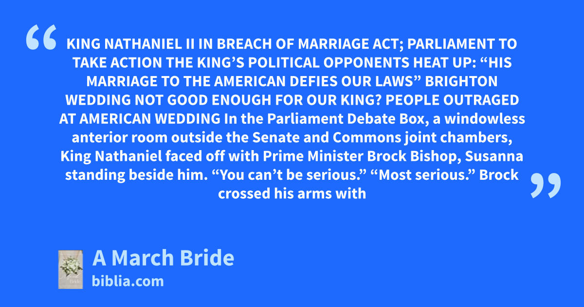 KING NATHANIEL II IN BREACH OF MARRIAGE ACT; PARLIAMENT TO TAKE ACTION THE KING’S POLITICAL OPPONENTS HEAT UP: “HIS MARRIAGE TO THE AMERICAN DEFIES OUR LAWS” BRIGHTON WEDDING NOT GOOD ENOUGH FOR OUR KING? PEOPLE OUTRAGED AT AMERICAN WEDDING In the Parliament Debate Box, a windowless anterior room outside the Senate and Commons joint chambers, King Nathaniel faced off with Prime Minister Brock Bishop, Susanna standing beside him. “You can’t be serious.” “Most serious.” Brock crossed his arms with