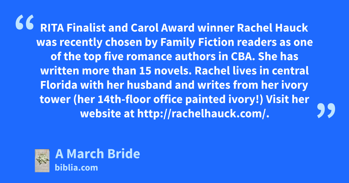 RITA Finalist and Carol Award winner Rachel Hauck was recently chosen by Family Fiction readers as one of the top five romance authors in CBA. She has written more than 15 novels. Rachel lives in central Florida with her husband and writes from her ivory tower (her 14th-floor office painted ivory!) Visit her website at http://rachelhauck.com/.