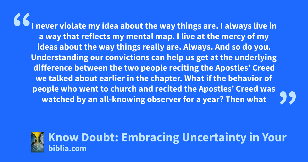I never violate my idea about the way things are. I always live in a way that reflects my mental map. I live at the mercy of my ideas about the way things really are. Always. And so do you. Understanding our convictions can help us get at the underlying difference between the two people reciting the Apostles’ Creed we talked about earlier in the chapter. What if the behavior of people who went to church and recited the Apostles’ Creed was watched by an all-knowing observer for a year? Then what
