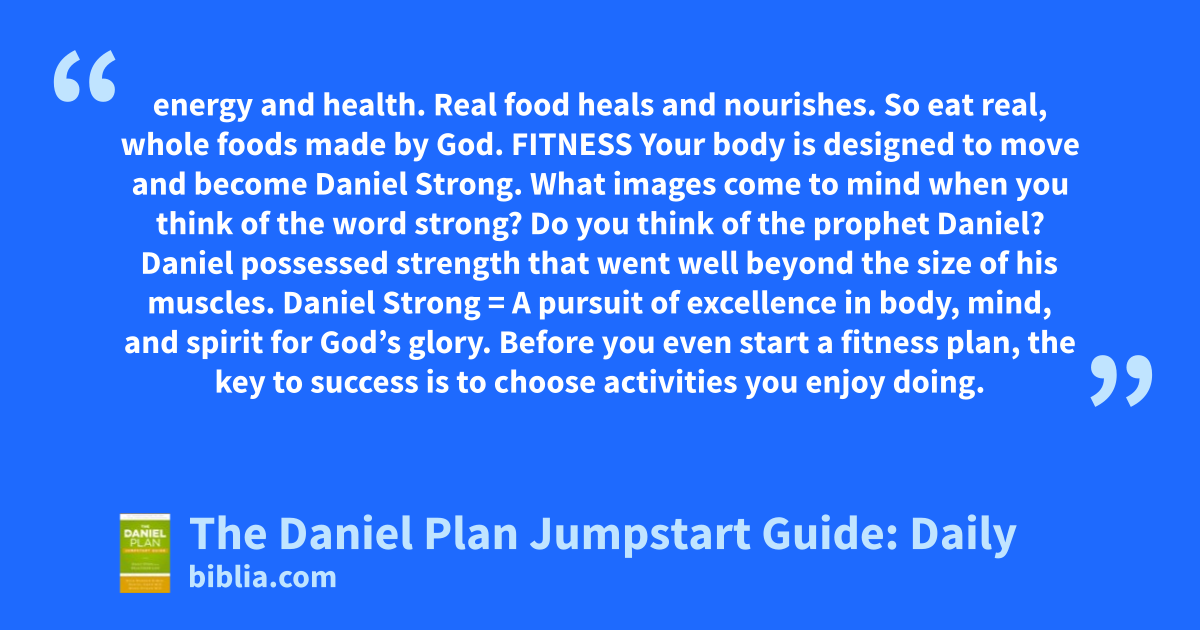 energy and health. Real food heals and nourishes. So eat real, whole foods made by God. FITNESS Your body is designed to move and become Daniel Strong. What images come to mind when you think of the word strong? Do you think of the prophet Daniel? Daniel possessed strength that went well beyond the size of his muscles. Daniel Strong = A pursuit of excellence in body, mind, and spirit for God’s glory. Before you even start a fitness plan, the key to success is to choose activities you enjoy doing.