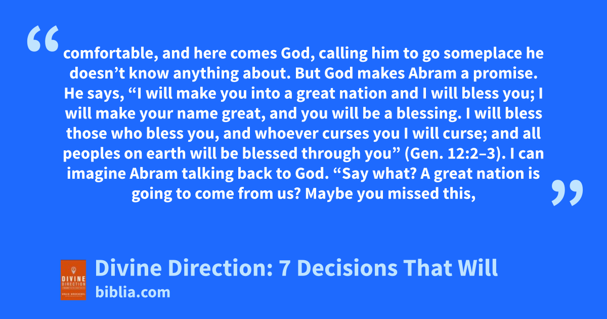 comfortable, and here comes God, calling him to go someplace he doesn’t know anything about. But God makes Abram a promise. He says, “I will make you into a great nation and I will bless you; I will make your name great, and you will be a blessing. I will bless those who bless you, and whoever curses you I will curse; and all peoples on earth will be blessed through you” (Gen. 12:2–3). I can imagine Abram talking back to God. “Say what? A great nation is going to come from us? Maybe you missed this,