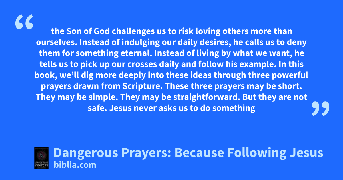 the Son of God challenges us to risk loving others more than ourselves. Instead of indulging our daily desires, he calls us to deny them for something eternal. Instead of living by what we want, he tells us to pick up our crosses daily and follow his example. In this book, we’ll dig more deeply into these ideas through three powerful prayers drawn from Scripture. These three prayers may be short. They may be simple. They may be straightforward. But they are not safe. Jesus never asks us to do something