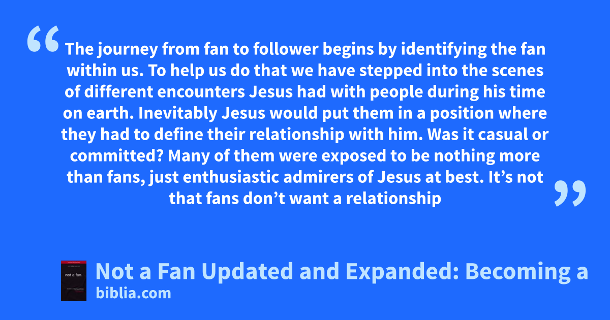 The journey from fan to follower begins by identifying the fan within us. To help us do that we have stepped into the scenes of different encounters Jesus had with people during his time on earth. Inevitably Jesus would put them in a position where they had to define their relationship with him. Was it casual or committed? Many of them were exposed to be nothing more than fans, just enthusiastic admirers of Jesus at best. It’s not that fans don’t want a relationship