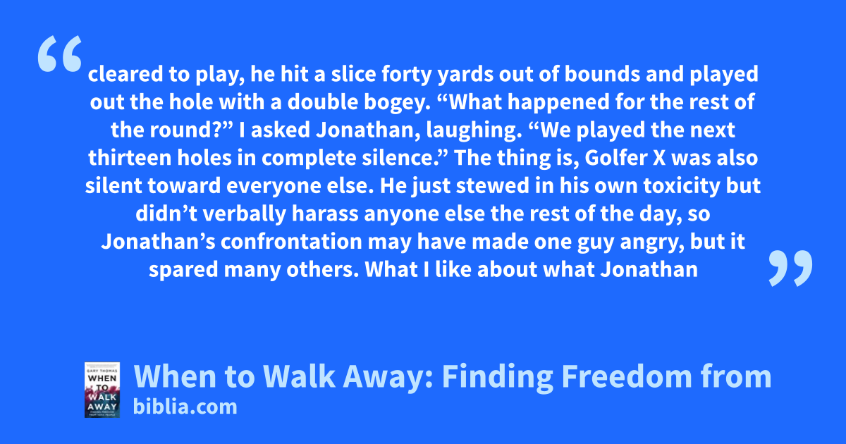 cleared to play, he hit a slice forty yards out of bounds and played out the hole with a double bogey. “What happened for the rest of the round?” I asked Jonathan, laughing. “We played the next thirteen holes in complete silence.” The thing is, Golfer X was also silent toward everyone else. He just stewed in his own toxicity but didn’t verbally harass anyone else the rest of the day, so Jonathan’s confrontation may have made one guy angry, but it spared many others. What I like about what Jonathan