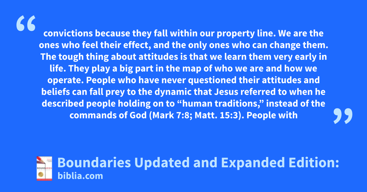 convictions because they fall within our property line. We are the ones who feel their effect, and the only ones who can change them. The tough thing about attitudes is that we learn them very early in life. They play a big part in the map of who we are and how we operate. People who have never questioned their attitudes and beliefs can fall prey to the dynamic that Jesus referred to when he described people holding on to “human traditions,” instead of the commands of God (Mark 7:8; Matt. 15:3). People with