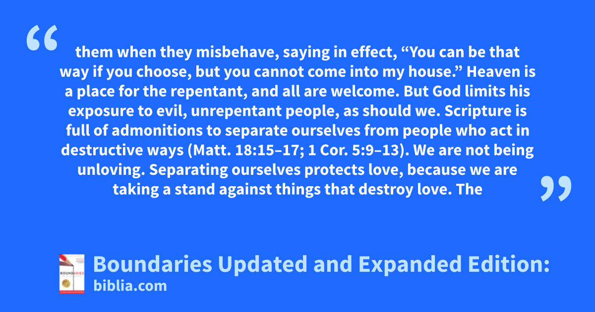them when they misbehave, saying in effect, “You can be that way if you choose, but you cannot come into my house.” Heaven is a place for the repentant, and all are welcome. But God limits his exposure to evil, unrepentant people, as should we. Scripture is full of admonitions to separate ourselves from people who act in destructive ways (Matt. 18:15–17; 1 Cor. 5:9–13). We are not being unloving. Separating ourselves protects love, because we are taking a stand against things that destroy love. The