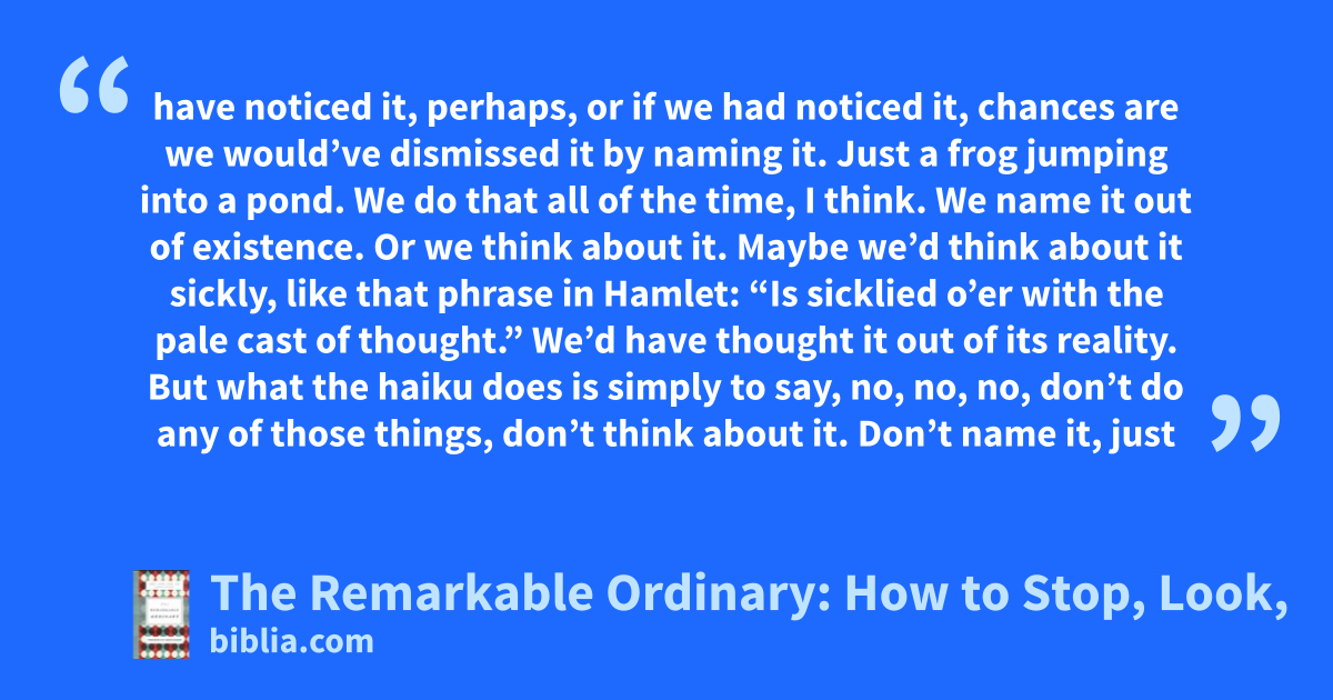 have noticed it, perhaps, or if we had noticed it, chances are we would’ve dismissed it by naming it. Just a frog jumping into a pond. We do that all of the time, I think. We name it out of existence. Or we think about it. Maybe we’d think about it sickly, like that phrase in Hamlet: “Is sicklied o’er with the pale cast of thought.” We’d have thought it out of its reality. But what the haiku does is simply to say, no, no, no, don’t do any of those things, don’t think about it. Don’t name it, just