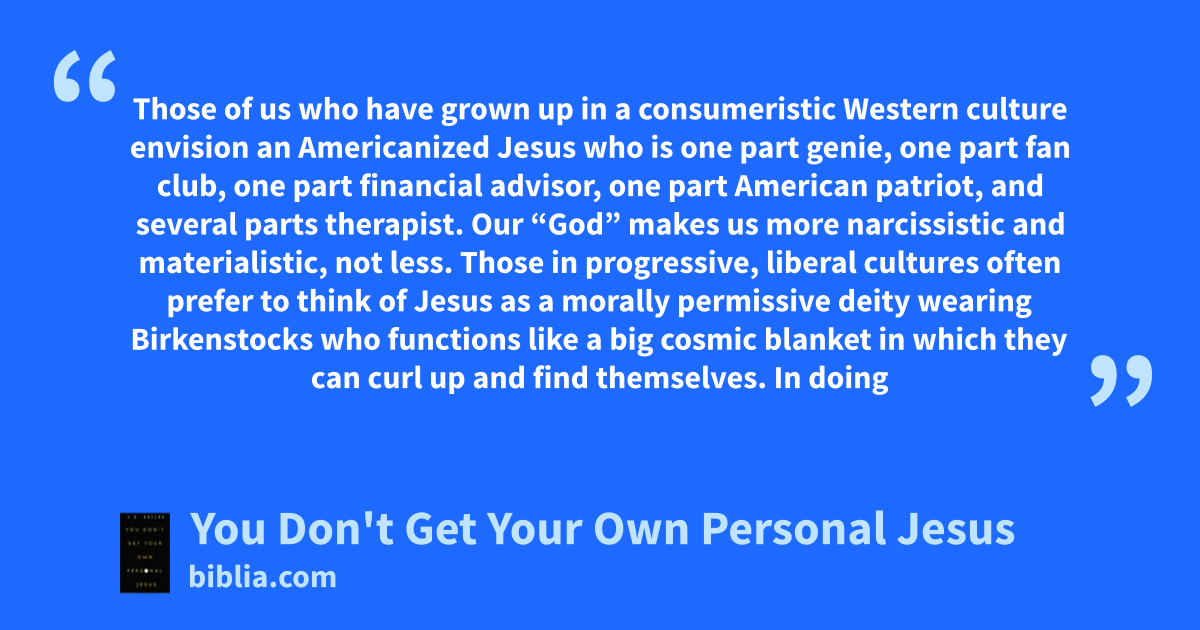 Those of us who have grown up in a consumeristic Western culture envision an Americanized Jesus who is one part genie, one part fan club, one part financial advisor, one part American patriot, and several parts therapist. Our “God” makes us more narcissistic and materialistic, not less. Those in progressive, liberal cultures often prefer to think of Jesus as a morally permissive deity wearing Birkenstocks who functions like a big cosmic blanket in which they can curl up and find themselves. In doing