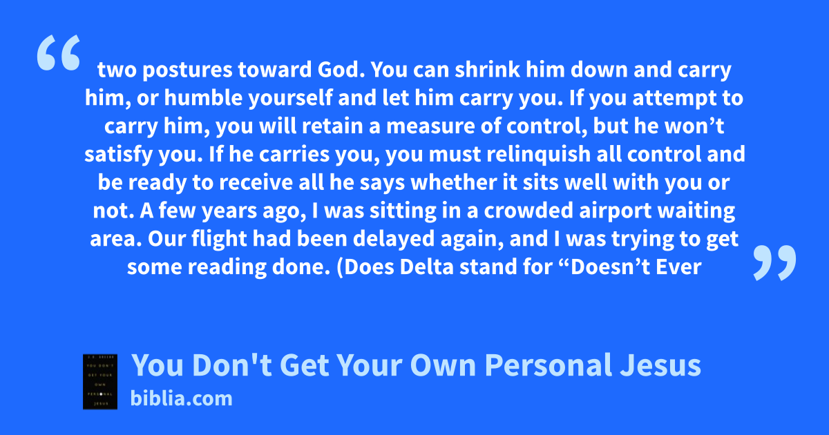 two postures toward God. You can shrink him down and carry him, or humble yourself and let him carry you. If you attempt to carry him, you will retain a measure of control, but he won’t satisfy you. If he carries you, you must relinquish all control and be ready to receive all he says whether it sits well with you or not. A few years ago, I was sitting in a crowded airport waiting area. Our flight had been delayed again, and I was trying to get some reading done. (Does Delta stand for “Doesn’t Ever